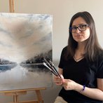 I paint landscapes in a modern contemporary style using acrylic paints. These artworks focus on calm, serene scenes where there is usually water, sky, and light. My purpose is to create pieces of art that bring calmness, simplicity, and an airy feel to the home. Through nature, I show states of the soul.