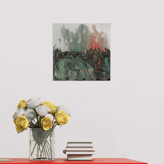A small-sized work that I offer for sale together with a frame. The floating frame makes the painting really attractive and festive with its modern and minimalist features. The sides of the artwork are painted black and look really stunning in the black frame. With its rich texture and bright colors, the painting will be a real jewel on the wall of your home.