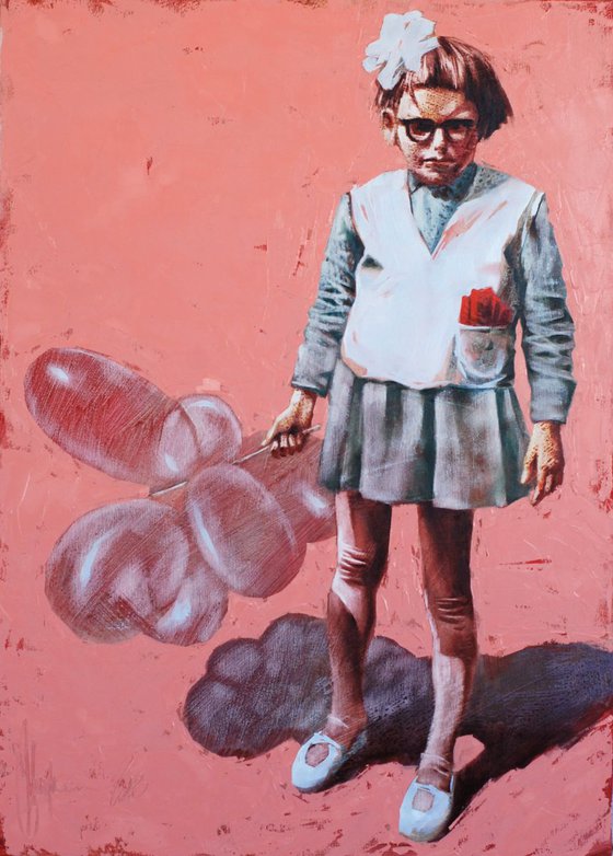 The fact is that I was born and raised in a country that no longer exists. If someone else remembers, there was such a terrible country the Soviet Union. It was a real empire of lies and evil. This is how the children looked on the holiday. I deliberately do not draw adults from that era. Adults always had a choice. The children had no choice. They had to match the adult's ideas about them and look accordingly. And these ideas could not be independent. All for all decided the ruling party. I wanted to call this picture an "unhappy girl." But then I remembered that we were still happy. even in this form.