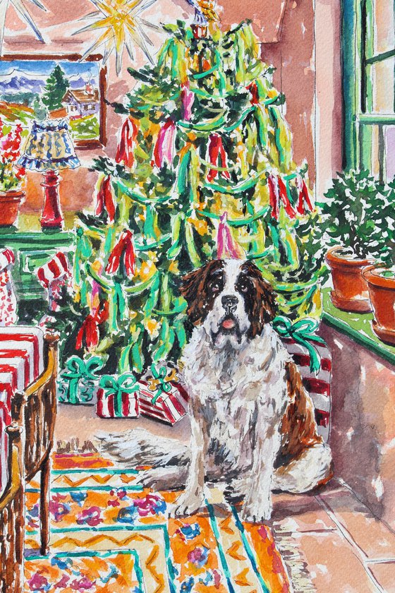"A Glowing Christmas With A Loyal Friend", An original 14" x 10" or 35.56cm x 25.4cm, watercolor and ink painting. Our family friends with whom we celebrated Christmas with when I was a child had a very sweet Saint Bernard named Cynthia. I would always look forward to seeing her! I added her to this scene as a sentimental touch as well as a few other special details including a painting of the Swiss Alps, a little dog bone tied to one of the presents and owl tree topper as I adore owls!