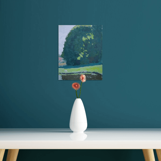 Immerse yourself in the harmony of nature with "A Moment of Silence". The artist captures the gentle light of a summer day filtering through dense green foliage and reflecting off a still pond. This scene is a true embodiment of inner calm and balance.