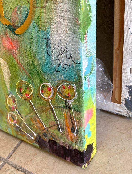 The expressive painting has lots of layers and is transmitting a mystical atmosphere. a warm green is transmitted groath and renewal. Gold represents generosity and wealth.