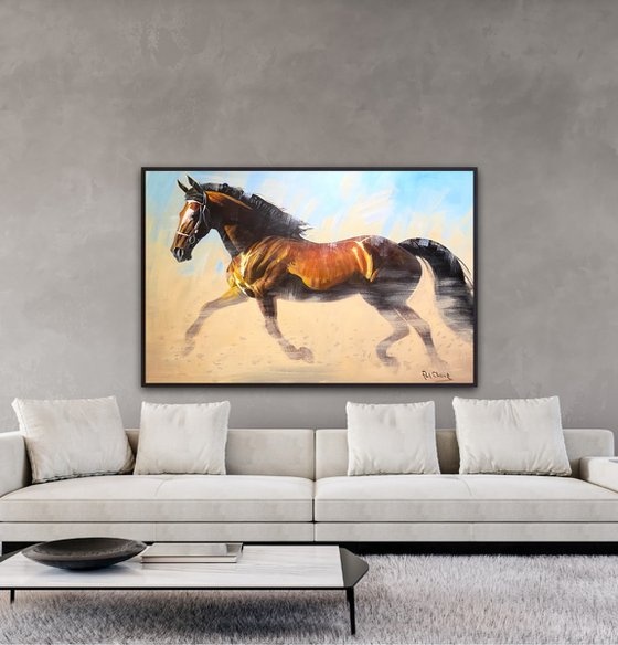 I aimed to capture the speed and power of a galloping horse, conveying a sense of unrestrained freedom. To enhance the dynamism of the composition, I employed the following artistic techniques: