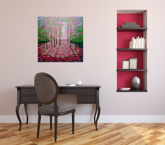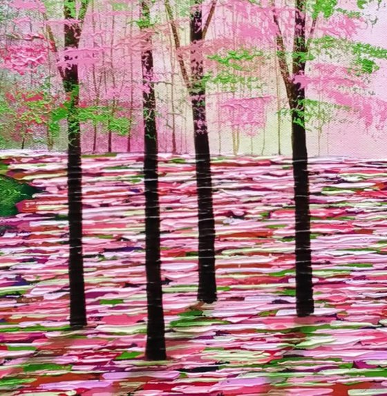 This painting was inspired by some lovely trees near my home in the Peak District. Sunlight plays through beautiful leaves creating dappled shadows and light, while the delicate textures contrast with the bright tones. Hues of pink, magenta, green and apricot bring to life a tranquil forest full of colour and vibrancy, celebrating nature and a peaceful forest bathing place.