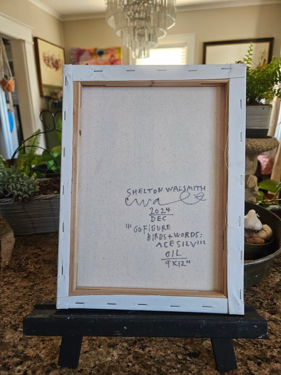 Go Figure Birds + WordsAce SilvJuxtaposition between the animal and human as well the presence of language and its relationship to apprehending meaning from it. A vibrant bird, the red and blue nurse and words. The word fragments Ace Silv share the pink space while being independent and autonomous and thwarting a figure ground relationship in favor of a fragmented collage-like picture plane The combination of these elements suspends an open ended scenario of suggestions and sensations rather than landing on a concrete conclusion or meaning.