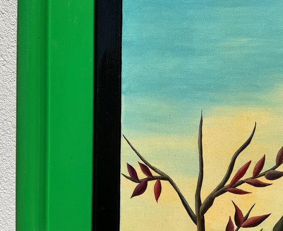 This artwork is sold framed with a green frame that goes with the tropical theme of the artwork.