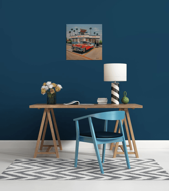 A vintage scene inspired by 1950s America made with oil colors on canvas measuring cm.50x50, thickness of the canvas cm.3 - signed on the front and also colored on the 3 cm side edges - can be hung even without a frame - ships everywhere with a certificate of authenticity and professional packaging