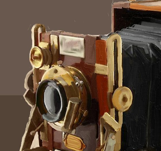 This is an acrylic painting of an F.H. Sanderson, bellows camera.