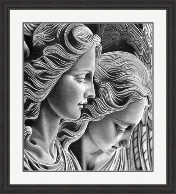 An original Pencil Drawing depicting two mournful angel sculptures.