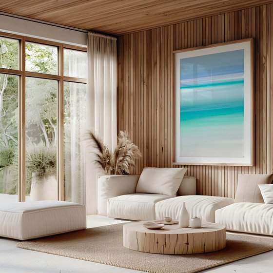 This soft summery artwork was inspired by the gorgeous waters of the Isle of Harris, a small island off the coast of Scotland. The deserted beaches with their silver sand and soft teal waters, are calming and restful. One can walk along the side of the water as it rolls softly over the sand and dream, this is a place of peace where you can escape the real world. When you visit this island you feel like you are in heaven, it is just that beautiful.