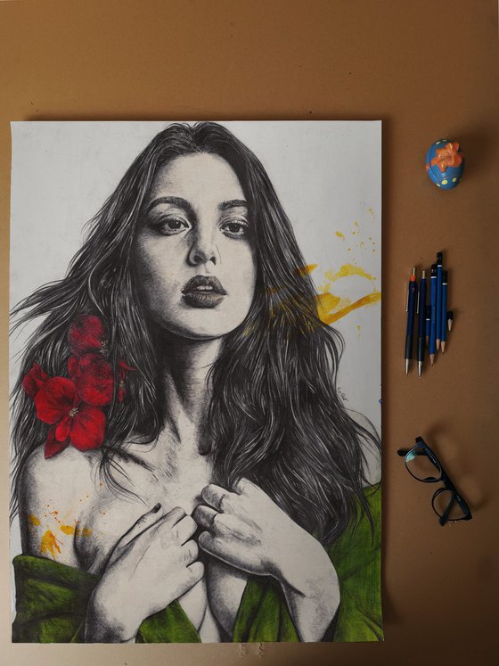 • Realistic pencil portrait of a beautiful woman adorned with red begonias beside her hair and draped in a loosely hung green garment. Splashes of yellow accentuate the monochrome aspects, adding vibrancy and contrast.