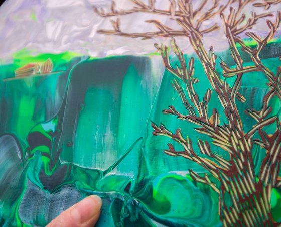 There are many fluid layers of art acrylic on a round wood birch panel, the tree is carved.