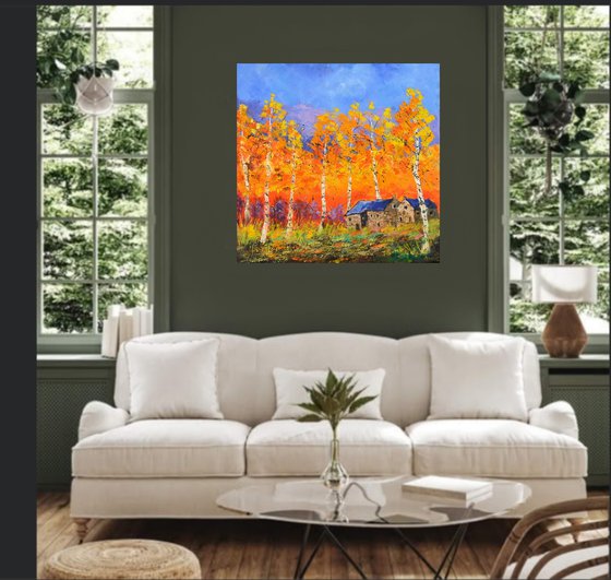 This dazzling work captures the vibrant essence of an autumnal landscape. In the foreground, slender birch trees, clad in golden leaves, form a majestic hedge. Their white bark contrasts beautifully with the flamboyant foliage. Behind them, a deep blue sky stretches forth, accentuating the warmth of the autumnal hues. A stone house nestles amidst this idyllic scene, its blue roof adding a touch of freshness to the painting. The bold colors, applied with a vigorous brushwork technique, infuse the whole with a lively energy. This marriage of warm and cool colors creates a striking visual dynamic. The artist masters the balance between flamboyant nature and human habitation, inviting the viewer to contemplate the fleeting beauty of autumn. This work celebrates the fleeting splendor of the season with remarkable intensity and precision.