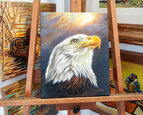 This painting by Norma Zaro depicts a majestic bald eagle, rendered in a realistic and expressive style. The piece, which appears to be done in acrylic on canvas, shows the bird in a solemn pose, looking upward and to the right, conveying a sense of greatness, pride, and vigilance.