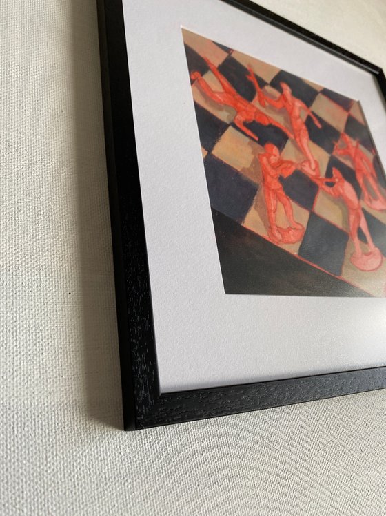 In the painting titled "Battlefield," the artist presents a chessboard adorned with toy soldiers in lieu of traditional game pieces. The artist's intention was to convey the metaphorical analogy drawn from their experiences while being treated in a hospital alongside both civilian and military patients. After listening to tales of commanders and their strategies, the artist recognized that these commanders perceive soldiers as mere pawns to achieve their goals. The depiction symbolizes the notion that soldiers are utilized by commanders regardless of the alignment with reality, compelling them to fulfill tasks set before them. The frame of the artwork is composed of an Italian baguette and features anti-reflective glass, making it ready to hang and enhancing the overall presentation.