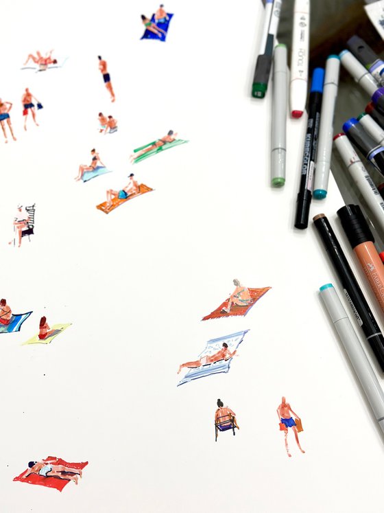 Beach Stories is my painting about summer beaches by the sea, lake or river, when people come together. It is a certain vibe to see many people on a sandy beach and everyone has their own business.