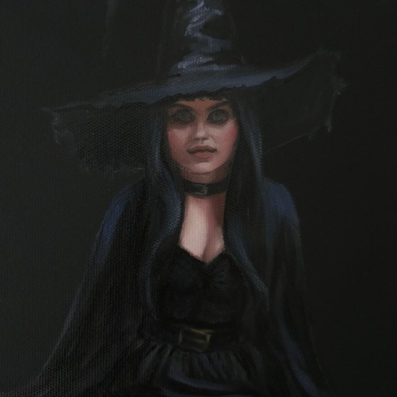 Inspired by fairy tales and mystical creatures, 'Beatrix' the witch is painted in chiaroscuro lighting for a dramatic effect.
