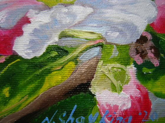 This bee and apple blossom oil painting captures a delicate moment of nature — a honeybee nestled inside a blooming flower. Painted in a realistic style with vivid spring tones, this small floral art original brings the freshness of pollination season right to your wall.
