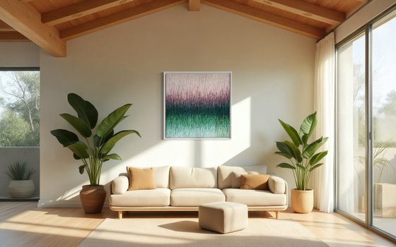 This artwork presents a mesmerizing gradient of cascading hues, expertly transitioning from soft pinks to deep greens. The vertical streaks, reminiscent of rainfall or a dense forest, create a dynamic texture that draws the viewer into its depths. The meticulous layering of colors reflects a masterful control over both palette and technique, evoking a sense of tranquility while also suggesting movement. This piece stands out for its ability to balance serenity with vitality, making it both a calming presence and a captivating visual journey. The unique blending technique employed creates a harmonious yet complex composition, leaving a lasting impression of both simplicity and sophistication.