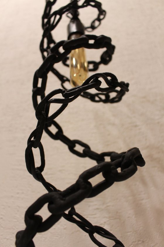 "This lamp embodies a fusion between mechanical robustness and artistic elegance. Each link, worked and reinvented, bears witness to a dialogue between brute force and refinement.
