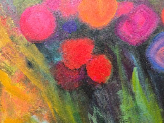“Bloom” is an expressive abstract floral that bursts with color and movement. Created with acrylics, this piece captures the joyful chaos of a garden in full bloom. Vivid reds, oranges, and magentas mingle with energetic blues and greens, suggesting petals in motion and the vibrant pulse of nature. The composition is both playful and dynamic, inviting the viewer to feel the vitality and spontaneity of growth. A celebration of color and life, “Bloom” brings the spirit of spring indoors.