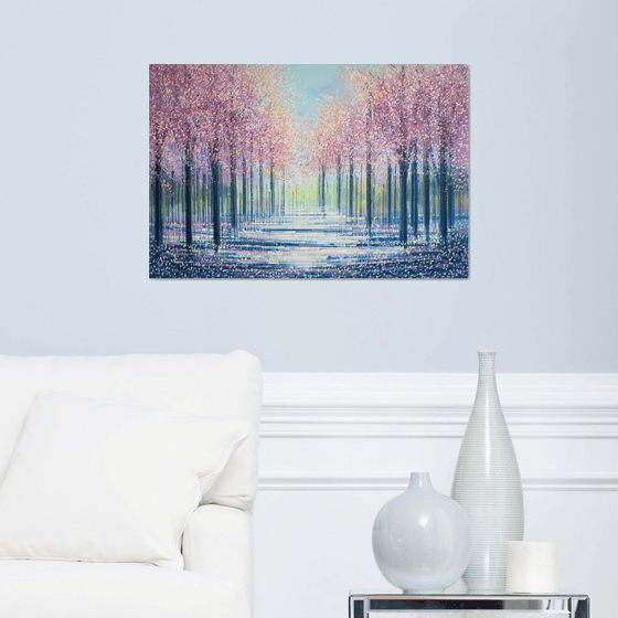 A contemporary impressionist painting of Spring blossom, painted in a mix of atmospheric colours, and created in my signature style, which utilises a range of textures, tools and painting implements to create a unique visual effect.