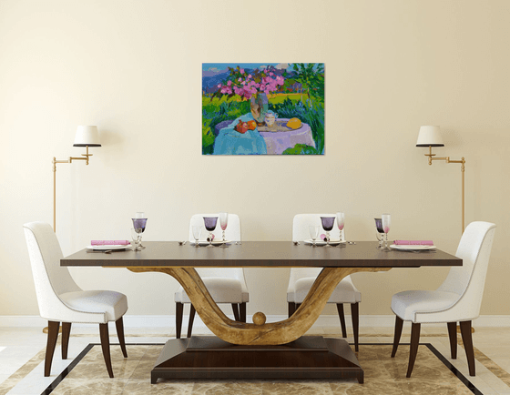 A vibrant still life portrays a table set outdoors with a vase of pink flowers, surrounded by lush greenery. Fruit, a teapot, and a cloth complete the serene and colorful composition.