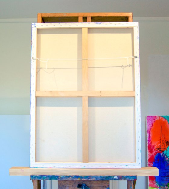 acrylic paints on canvas stretched over a timber frame. Ready to hang, complete with D-rings and strong adjustable cord. Framing not needed as painted on sides.