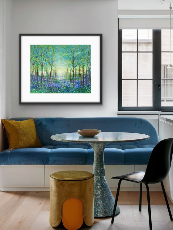 One of my typical, bluebell woodland paintings. Inspired by the area where I live and the various woodland walks around Lancashire. Bluebells and wildflowers litter the ground, giving a beautiful carpet of colour, whilst an inviting pathway invites in on a woodland wander.