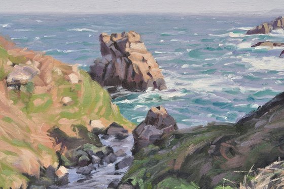 Cap Sizun offers a spectacular landscape of rugged coasts and steep cliffs plunging directly into the Atlantic. In this painting, I have tried to capture the winding stream that weaves between the cliffs, a continuous life current joining the ocean.