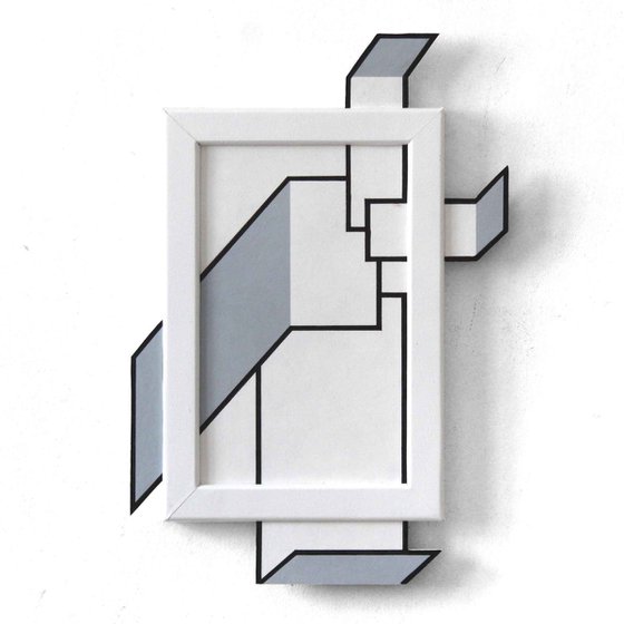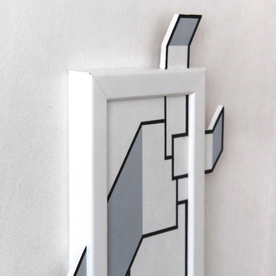 This work blends geometry and optical illusion by using a three-dimensional frame to deconstruct the boundary between art and reality. The sharp black lines draw angular shapes that appear to bend and extend beyond the frame, creating a sense of depth and movement. The shades of gray representing shadow add contrast and intrigue, accentuating the interlocking geometric shapes. The white frame, the central element, serves not only to contain the image but also to challenge its boundaries, giving the impression that the structure emerges from the flat surface. This interplay between interior and exterior encourages the viewer to reconsider the traditional perception of space in art. The work demonstrates a mastery of minimalism, where each line and shape is carefully calculated to push the boundaries of the artistic imagination.
