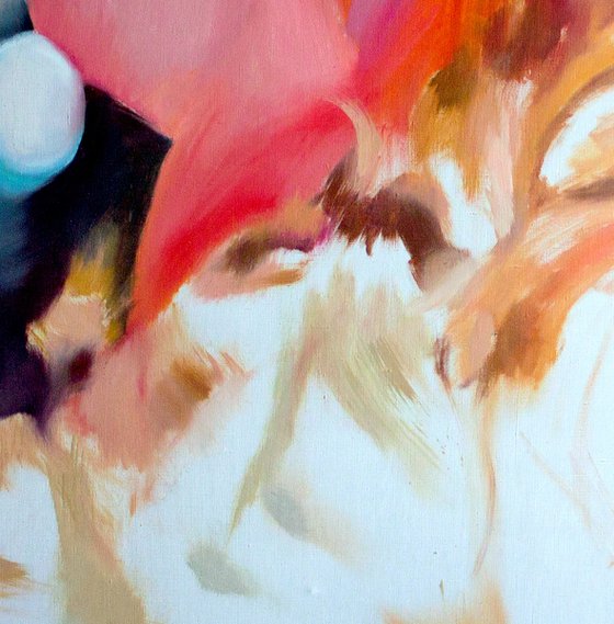 Rendered in warm tones of crimson, orange, pink, and champagne, Galan’s brushwork is confident, emotional, and slightly unrestrained. The figure is not about anatomical perfection, but about feeling – unfiltered, ecstatic, present.