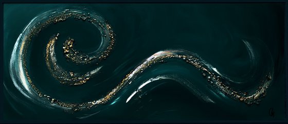 This abstract painting is made in blue tones, black, white and gold. The piece is deeply structured to give it amazing depth. A matte finish conserves the beauty of your painting.