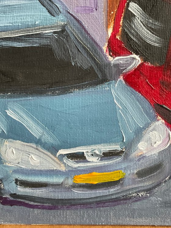 An evocative oil on canvas board measuring 24x30 cm, this painting was created during an en plein air session in the picturesque Netherlands. The composition centers on a residential setting, highlighting a red and a blue car parked outside a building featuring a notable roof extension. The interplay of light and shadow, combined with the artist's expressive use of color, transforms this ordinary street view into a captivating study of contemporary life and architecture.