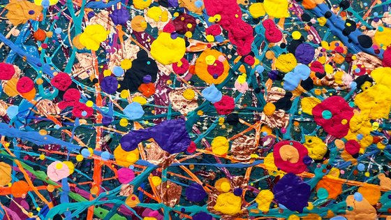Painting style - the paint is applied in threads. The threads of paint seem to intertwine, creating their own canvas. Painting is made using multi-layer paint technique. A million multi-colored splashes dry before each subsequent coat of a colored the threads of paint is applied. In general, the painting has more then 50 layers of the application of colorful splashes.