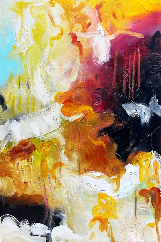 A radiant fusion of bold strokes and dreamy textures, Celestial Drift captures the sensation of floating between light and shadow. Warm oranges, golden yellows, and soft whites swirl upward against a dramatic backdrop of deep burgundy and black, evoking movement, emotion, and cosmic energy.