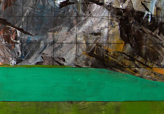 The layered paintings in this series show marks and imagery layered upon each other over a long period of time, in the same way that happens to the land and subsequent structures upon it.