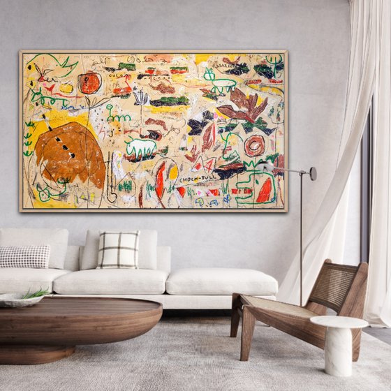 The work is inspired by cave paintings, also appearing elements of Nature and some figures inspired by science fiction films. All expressed on a canvas that looks like an advertising wall of any contemporary city, with stains, dirt and random graffiti.
