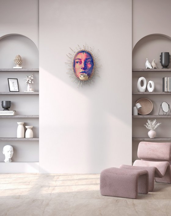 Crafted from air-dry clay, beads, and metal wire, these mixed media wall objects evoke sacred imagery while reflecting deeply personal transformation.