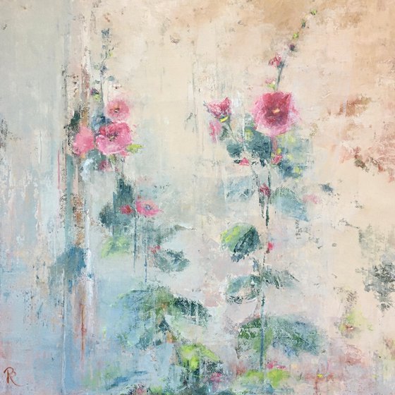 I'm lucky enough to spend a good deal of time in France, at a charming farmhouse full of inspiring things and a timeless French country garden. The equivalent of a sweetie shop to an artist! This piece was inspired by the tall spears of hollyhocks against the soft stone of a seventeenth century coach house wall. The piece has an evocative, yet fresh appeal. The use of a palette knife to introduce a small degree of texture adds both depth and interest.