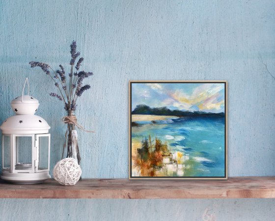 "Coastal Riverie" showcases a radiant landscape bathed in blue and golden hues, where fields shimmer under a warm, sunlit glow. Painted with acrylics on gallery-wrapped canvas, it invites viewers into a serene, timeless countryside filled with beauty and tranquility.