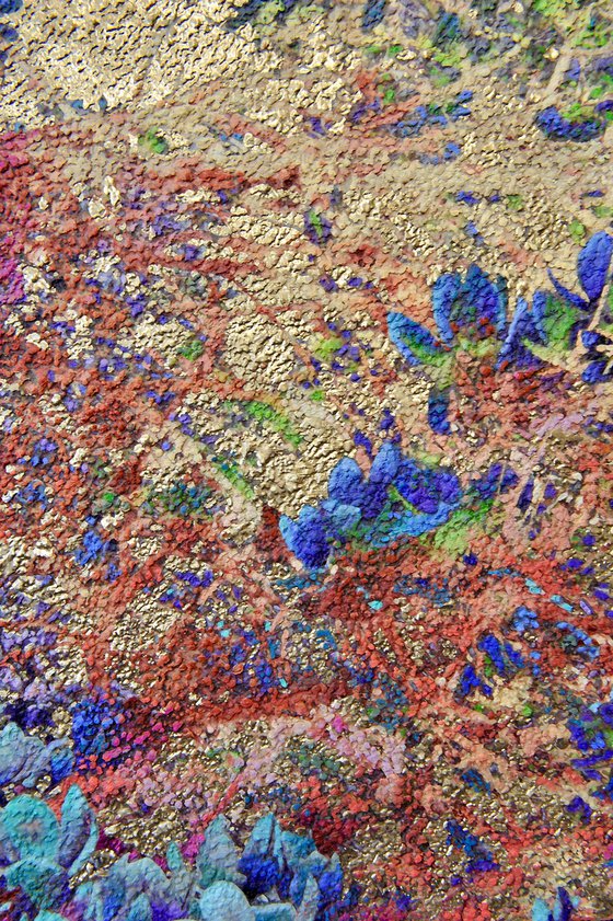 This piece is part of my chrome series and is created on a linen canvas mounted on a wooden 3D frame. A hand-painted, thick floating frame in a matching colour surrounds it. The work was developed using digital techniques, such as Photoshop. I then printed and enhanced the image with gel medium, acrylics, oil paint, oil sticks, and gold chrome paint. These materials were applied with palette knives, rollers, sponges, brushes, and my fingers, creating rich texture and depth. The final size is 50x50 cm, but including the frame, it measures 55x55 cm and is 6 cm thick. The title of the work is Cobalt & Pink Golden Magnolias. This process creates a captivating interplay between digital precision and manual craftsmanship, often creating an intriguing and powerful image. The result is a unique, layered composition combining modern techniques and traditional artistic skills.