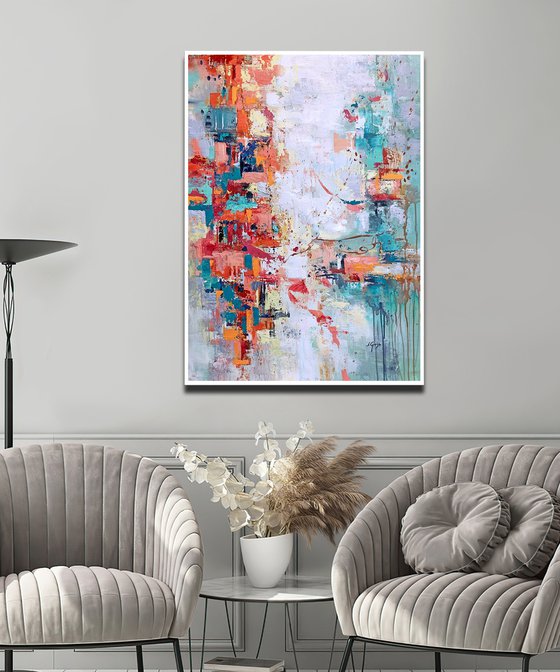 Painted on Gallery back wrapped stretched canvas, painted edges as continuation of the piece, ready to hang.