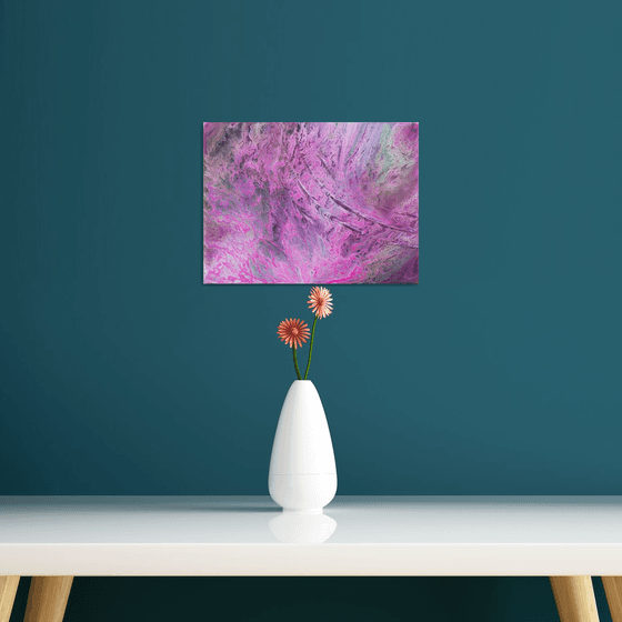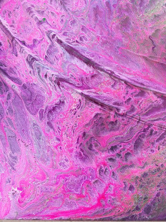 This piece is a completely unique and original abstract acrylic painting on canvas. It is an exercise in fluid painting. This piece is stunning in its soft, fluid movement. Beautiful greens, white, pinks and violets dance with each other, creating some sort of ethereal cosmic landscape, punctuated by waves of texture from another layer that gives the illusion of ripples flowing across the surface of the painting. There is a strong cosmic feel to this piece, like a view of some ethereal sky deep in the vast universe. It is magical, peaceful and hopeful. It is the 77th in my new series of abstract acrylic works.