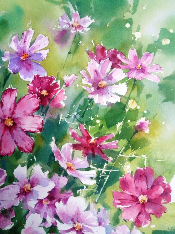 This painting is the embodiment of a carefree summer day, the bright summer sun, and the gentle wind softly swaying the colorful heads of cosmos flowers against the backdrop of the serene blue sky. It feels as if you can sense the light fragrance of these simple yet surprisingly beautiful flowers.