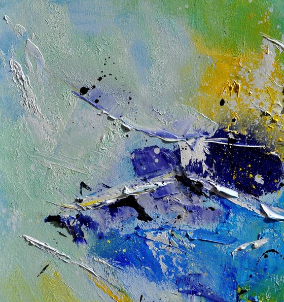 This vibrant and captivating abstract artwork evokes a whirlwind of emotions through its bold use of color. Dominant shades of blue, green, and touches of yellow blend harmoniously, creating a striking dynamic. White splashes and strokes add bold texture, guiding the eye across the canvas. The messy yet intentional composition seems to capture movement, an almost palpable energy. Dark areas contrast with bright hues, adding depth and mystery. This painting embodies a controlled spontaneity, leaving room for personal interpretation. The artist successfully merges chaos and harmony, inviting the viewer to explore each detail at their own pace. A powerful work that challenges and frees the imagination.