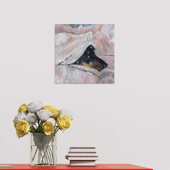 Oil portrait of a dachshund under a blanket during wet weather when going outdoors does not appeal. On cradled wood panel, with fixings provided ready to hang.