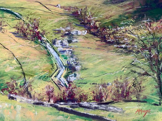 A view of the Yorkshire Dales close to Appletreewick, painted on a sunny springtime day using expressive and intuitive pastel strokes.
