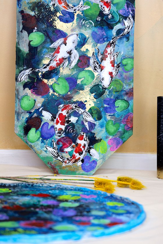 Deeply Connected is a richly textured koi pond painting that celebrates harmony, resilience, and spiritual flow. Created on a solid wood panel, this one-of-a-kind piece features heavily layered textures that bring the koi fish and water elements to life with striking dimensionality.