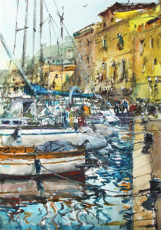 Original Watercolor on paper 14.5 H x 9.5 W inch.(37x25 cm) -Docked Boats- depicts the coastal city Port of Salerno close Amalfi Coast (Italy) with typical fishing boats and sailing boats tied close at dock with ropes and lines, during an autumnal day. Made on location in the city of Salerno, Plein air watercolor, dated and signed on both sides 2022; on paper watercolor, Saunders Waterford 300 gsm with white borders and deckle edges.